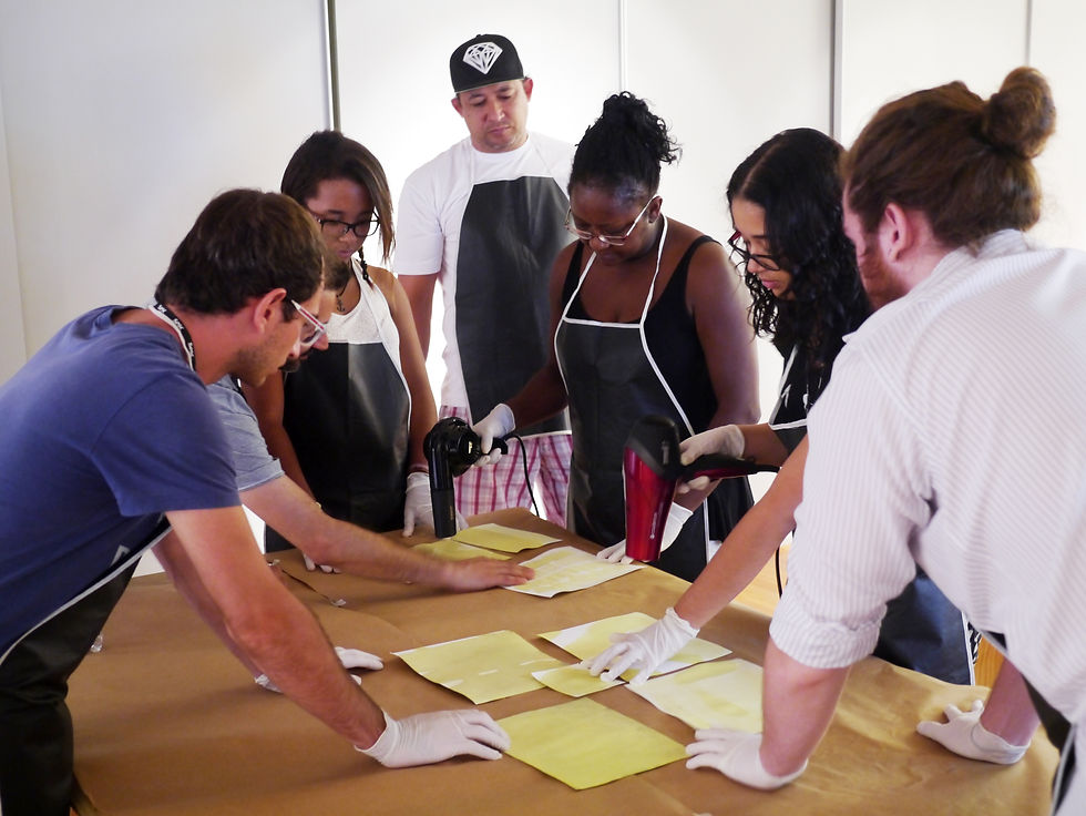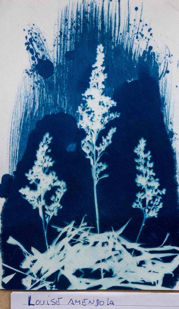 Sábado os participantes se revezavam entre as animadas estações de emulcionamento, secagem, composição, exposição e lavagem para então terem seus belos cianótipos pendurados no varal e depois levá-los para casa.