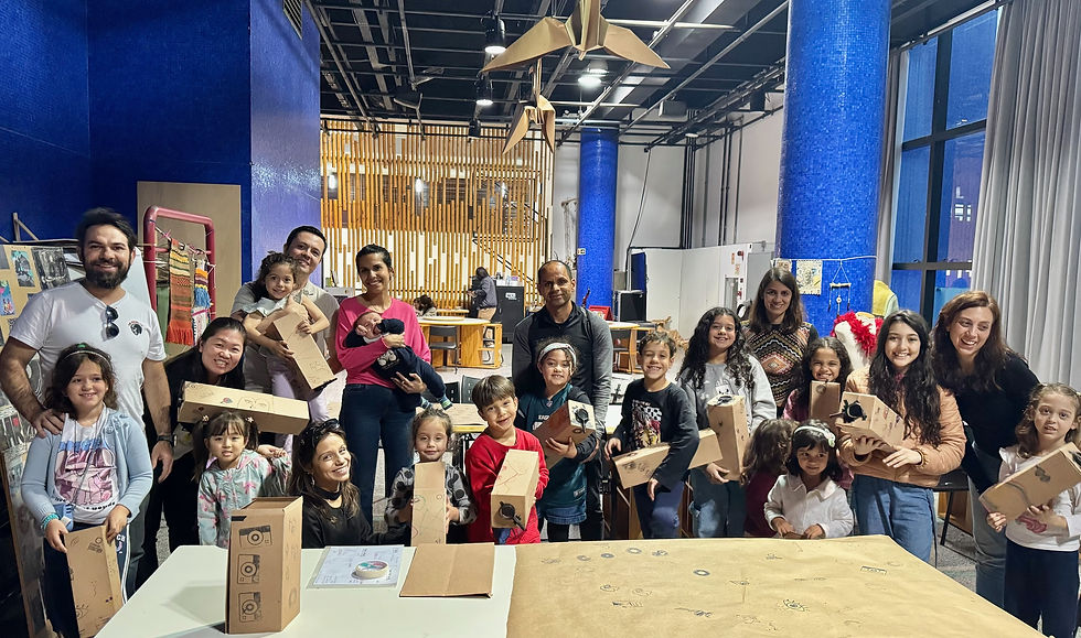 Utilizando materiais acessíveis e muita criatividade, cada pessoa montou seu próprio aparato e pôde experimentar, na prática, os efeitos da projeção invertida. Mais do que um exercício técnico, a atividade despertou o olhar atento, a sensibilidade e o encantamento com o mundo ao redor — um convite à observação poética do cotidiano. Agradecemos imensamente a todas as famílias que participaram dessa experiência tão especial, e aos parceiros que tornam possíveis esses encontros que estimulam a imaginação e o fazer manual. Continuamos sempre abertos a novas ideias e colaborações futuras.